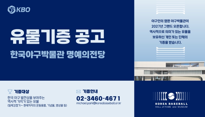 기증 대상은 한국 야구의 발전상을 보여주는 역사적 가치가 있는 유물이며, KBO 정책지원팀 박물관파트 아카이브센터로 전화 또는 이메일을 통해 신청 가능하다.