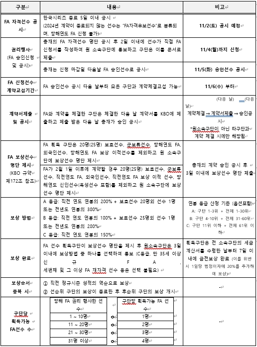 2025년 FA 자격 선수는 공시 후 2일 이내인 11월 4일(월)까지 KBO에 FA 권리 행사의 승인을 신청해야 하며, KBO는 신청 마감 다음 날인 11월 5일(화) FA 권리를 행사한 선수들을 FA 승인 선수로 공시할 예정이다.
