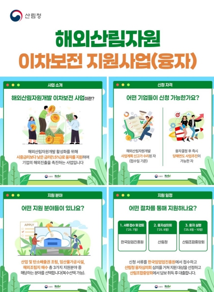 [뉴스서치] 산림청은 국내 기업의 해외산림자원개발을 적극 지원하기 위해 ‘2025년 제2차 해외산림자원개발 이차보전 사업’ 참여자를 오는 7월 1일부터 7월 28일까지 모집한다고 밝혔다.