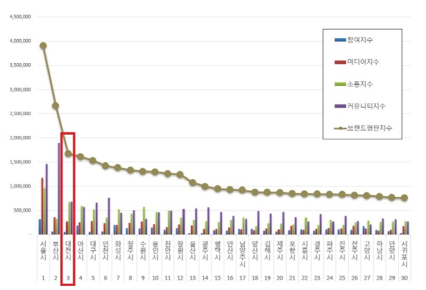 이번 조사에서 대전시의 브랜드 평판지수는 참여지수 57,992, 미디어지수 270,872, 소통지수 671,899, 커뮤니티지수 677,831로 분석됐으며 소통지수와 커뮤니티지수에서 높은 점수를 받았다.