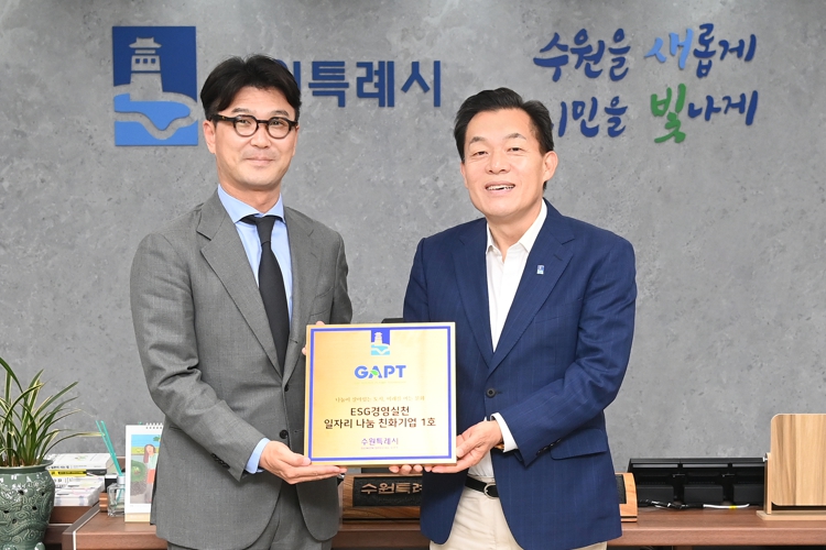 수원시는 19일 수원시청에서 수원시 중소기업인 ㈜갭텍과 ‘ESG경영실천·일자리나눔 친화기업 1호 업무협약’을 체결했다.