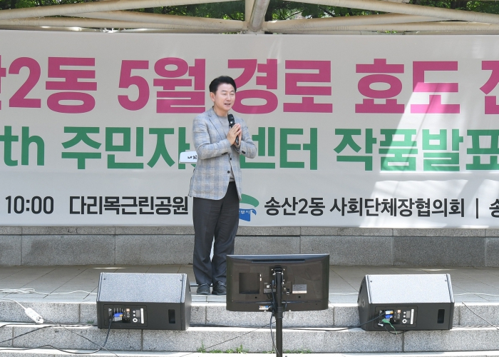 ▲ 김동근 시장이 5월 10일 다리목근린공원에서 열린 ‘송산2동 5월 경로 효도 잔치 with 주민자치센터 작품발표회’에서 축사를 하고 있다. |