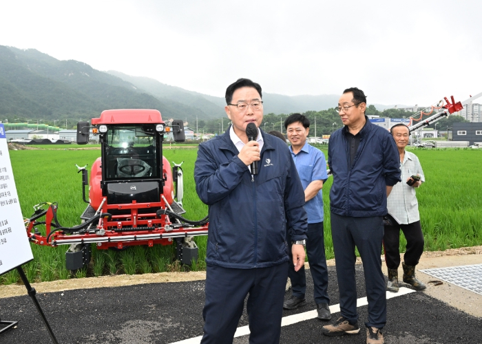 ▲ 강수현 양주시장, 농가 노동력 절감을 위한 ‘붐스프레이어 활용 벼 약제 살포 연시회’ 현장 방문 |