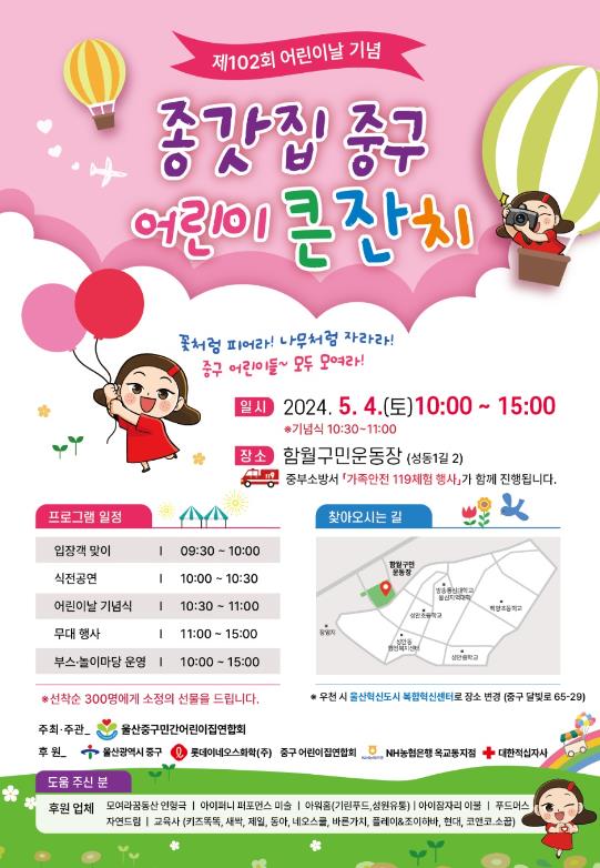 [뉴스서치] 제102회 어린이날 맞이 2024년 ‘종갓집 중구 어린이 큰잔치’ 행사가 오는 5월 4일 오전 10시부터 오후 3시까지 함월구민운동장에서 열린다.