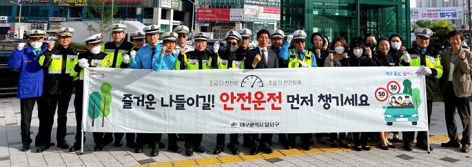 달서구는 이날 성서녹색어머니회, 성서모범운전자회 등 교통봉사단체와 성서경찰서, 구 직원 등 40여 명이 참여한 민‧관 합동 캠페인을 실시했다.