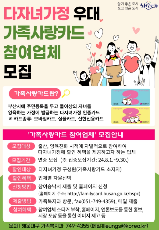 ▲ 해운대구, ‘다자녀가정 우대 가족사랑카드 참여업체’모집 |