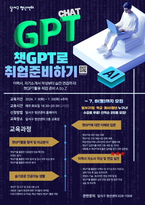 달서 청년 아카데미 역량강화 과정 7월 프로그램인 '챗GPT와 취업 준비하기'는 취업을 준비하는 청년들을 대상으로 7월 9일부터 7월 30일까지 매주 화요일 총 4회에 걸쳐 운영한다.
