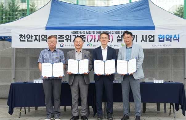 시는 9일 직산 삼은공원에서 금강유역환경청, ㈜신세계푸드, 천리포수목원과 ‘천안지역 멸종위기종 살리기 사업 협약’을 체결했다.