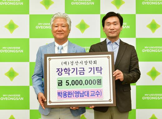 [뉴스서치] (재)경산시장학회는 박용완 교수(영남대학교)가 3일 인재 육성을 위한 장학금 5백만원을 기탁했다고 밝혔다.
