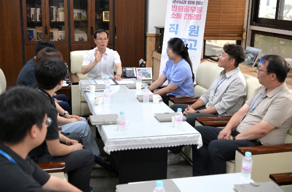 [뉴스서치] 음성군은 8일 집무실에서 ‘군수님과 함께하는 직원신문고’라는 제목으로 간담회를 열어 행정 최일선에서 근무하는 민원 담당 공무원들과 소통의 시간을 가졌다.
