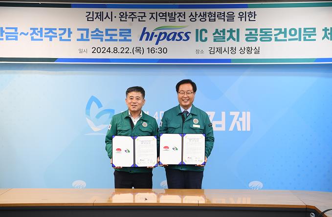 22일 유희태 완주군수와 정성주 김제시장은 김제시청 상황실에서 새만금-전주간 고속도로 하이패스 IC 설치 사업을 촉구하는 공동건의문에 서명하고 협력 의지를 다졌다.