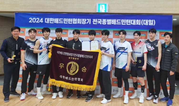 ▲ 2024 대한배드민턴협회장기 전국종별배드민턴대회 남자 일반부 단체전 우승을 차지한 밀양시청팀이 기념사진을 찍고 있다. |