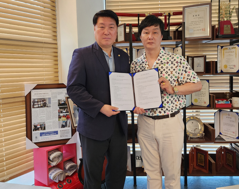 ▲ 국제청년환경연합회 김석훈 총재(좌)와 BLA 황재성 협회장(우) 협약식 |