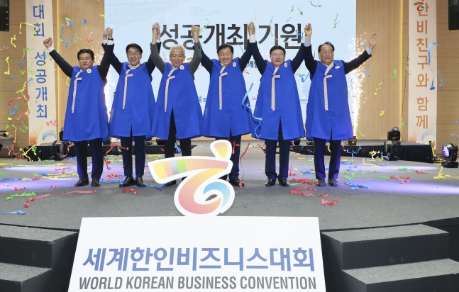 | ▲ 16일 전북대학교 컨벤션홀에서 열린 2024 세계한인비즈니스대회 자원봉사자 ‘한비친구’ 발대식에 김관영 도지사와 이상덕 재외동포청장, 문승우 도의장, 우범기 전주시장을 비롯한 자원봉사자들이 성공개최 기원 퍼포먼스를 하고 있다. |