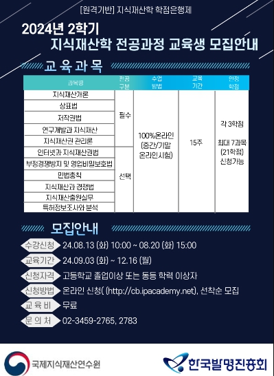 [뉴스서치] 특허청 국제지식재산연수원은 8월 13일부터 20일까지 ’24년 2학기 지식재산학 학점은행 온라인 수강생을 모집한다.