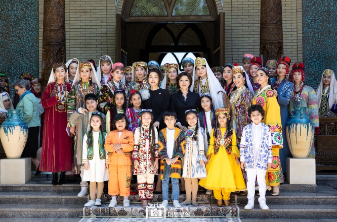 [뉴스서치] 김건희 여사는 6월 14일 오전 쿡사로이 대통령궁 영빈관에서 우즈베키스탄 영부인인 '지로아트 미르지요예바(Ziroat Mirziyoyeva)' 여사와 친교 시간을 갖고 미르지요예바 여사가 직접 세심히 준비한 우즈베키스탄 전통 문화행사에 참석했다. 또한 한국에 6년 넘게 거주해 한국과 남다른 인연을 갖고 있는 미르지요예바 여사의 차녀인 '샤흐노자 미르지요예바(Shahnoza Mirziyoyeva)' 사회보장청 제1부청장도 김 여사의 방문을 환영하기 위해 동 행사에 깜짝 참석했다.
