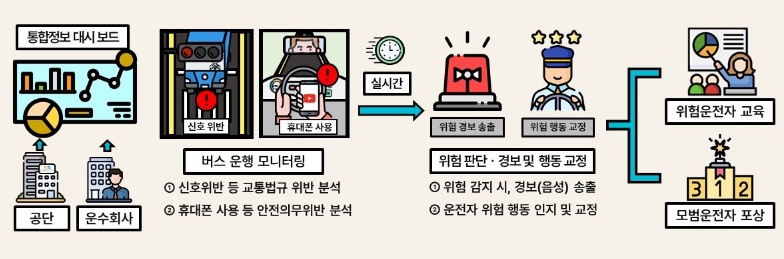 AI활용 안전운행 지원사업은 차량 전방과 내부에 설치한 AI 영상분석 카메라로 버스 운전자의 위험운전행동을 실시간 모니터링하고 운전자에게 즉시 피드백을 주는 솔루션으로, 버스 운전자가 운전 도중 신호위반, 중앙선 침범, 휴대전화 사용, 졸음운전, 전방주시 태만 등 중대 법규위반 행위를 하면, AI 단말기가 즉시 운전자에게 경고음을 울린다.