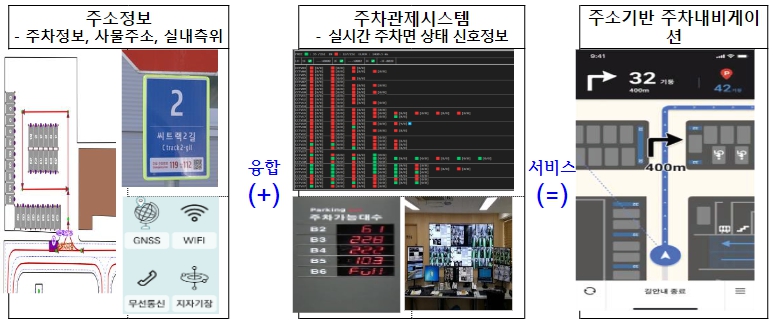 ‘주차내비게이션’은 주차면에 사물주소를 부여하여 ‘주차정보’와 주차관제시스템의 실시간 주차면 상태 ‘신호정보’를 융합해 내비게이션이 주차 가능한 개별 주차면을 안내하는 서비스다.