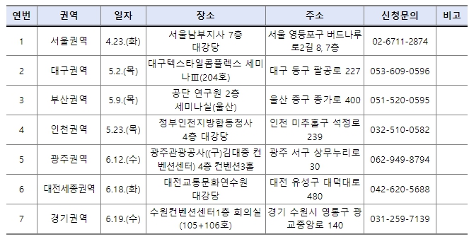 지역별 릴레이 세미나는 대구(5.2.) 이후에도 부산(5.9.), 인천(5.23.), 광주(6.12.), 대전(6.18.) 및 경기(6.19.) 등 주요 권역별로 연이어 개최된다.