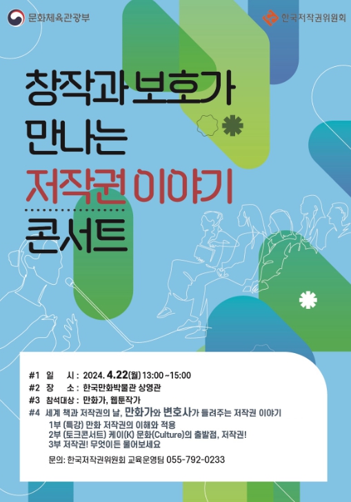 문체부 정향미 저작권국장은 “이번 ‘저작권 이야기 콘서트’는 자신의 작품을 효과적으로 보호하며, 창작활동에서 발생할 수 있는 법적 문제를 예방하는 데 도움을 주기 위해 기획했다.”라며, “앞으로도 창작인들이 자신의 권리를 적극적으로 주장하고 보호받는 환경을 만드는 데 노력하겠다.”라고 밝혔다.