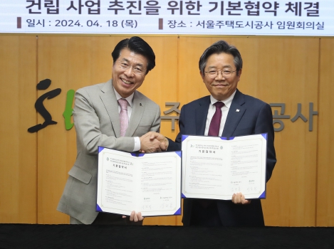 ▲ 4월 18일 SH공사 임원회의실에서 진행된 ‘송파구-SH공사 기본협약 체결식’ 서강석 송파구청장(좌)과 김헌동 SH공사 사장(우) |