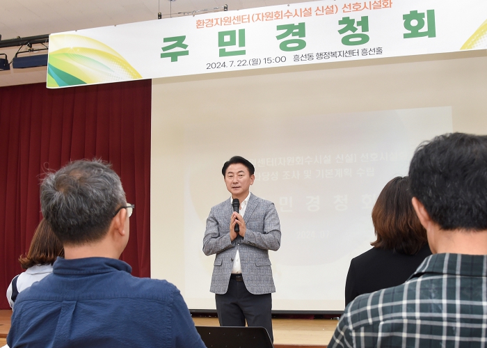 ▲ 김동근 시장이 7월 22일 흥선동행정복지센터에서 개최된 ‘환경자원센터(자원회수시설 신설) 선호시설화 주민경청회’에서 인사말을 하고 있다. |