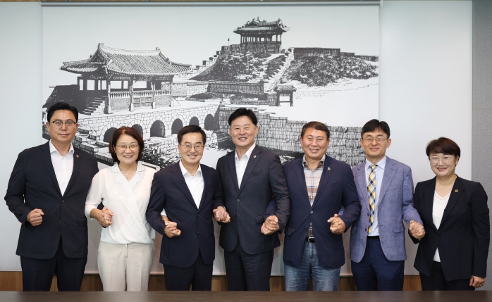 최종현 대표의원 취임 이후 김동연 지사의 첫 번째 방문에 이용욱 총괄수석(파주3), 명재성 정무수석(고양5), 신미숙 기획수석(화성4), 고은정 경제노동위원장(고양10) 등이 함께 해 김동연 지사의 방문을 환영했다.