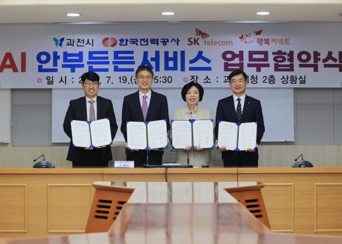 [뉴스서치] 과천시가 고독사 예방을 위해 사회적 고립 가구의 안부를 24시간 확인하는 ‘AI 안부든든 서비스’의 시범 도입을 추진하는 가운데, 19일 시청 상황실에서 한국전력공사 남서울본부, SK텔레콤, 재단법인 행복커넥트 와 업무협약을 체결했다.