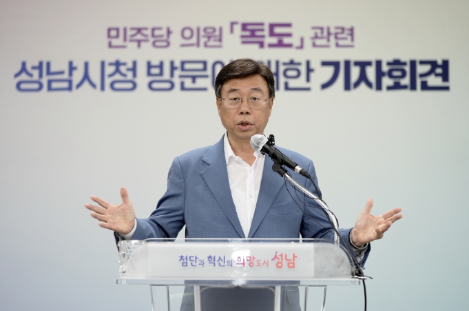 신 시장은 이날 오후 시청 모란관에서 기자회견을 열고 “민주당 중앙당에서 독도 지우기 프레임으로 성남시를 거론하는 것은 지방 사무에 대한 중앙 정치권의 과도한 간섭이며, 92만 성남 애국시민에 대한 모독”이라며 “독도는 지운다고 지워지지 않는 우리 고유 영토”라고 말했다.