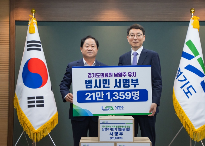 남양주시(시장 주광덕)는 12일 경기도청을 방문해 김성중 행정1부지사에게 경기동북부 공공의료원 후보지 선정 제안서와 함께 시민 21만1,359명의 서명부를 전달했다.
