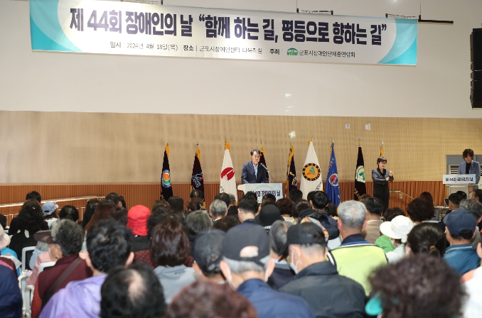 [뉴스서치] 군포시는 4월 18일 군포시장애인센터에서 군포시장애인단체총연합회(회장 박상환)주관으로 장애인단체 관계자들을 비롯해 하은호 군포시장, 이길호 군포시의회 의장, 국회의원, 도의원, 시의원 등이 참석한 가운데 제44회 장애인의 날 기념식을 개최했다.