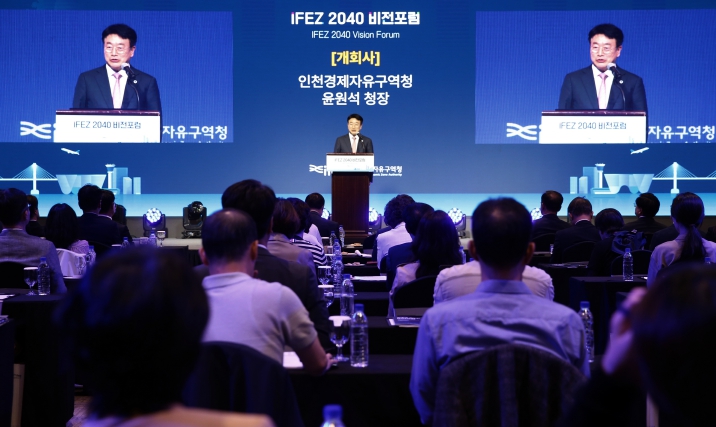 IFEZ 2040 비전 발표를 위해 직접 연단에 오른 윤원석 청장은 2040년을 목표로 한 미래상을 제시하고, 갯벌 매립과 도시 발전을 이룩한 인천경제자유구역 1.0 시대를 뛰어넘어 인천경제자유구역 2.0 시대를 향한 4대 비전을 발표했다.
