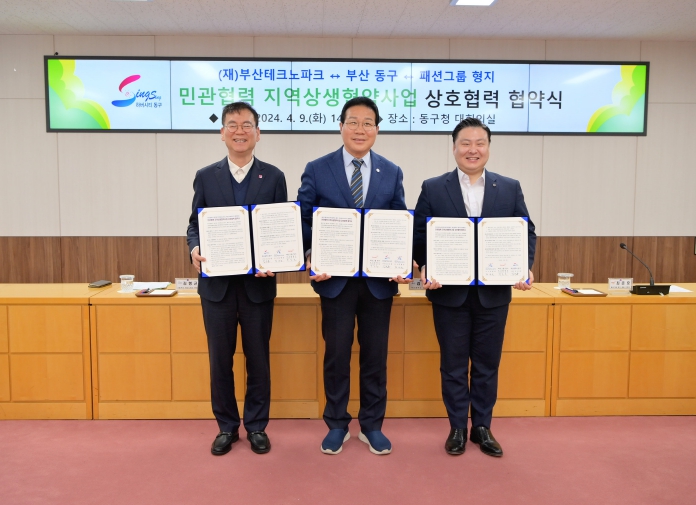 [뉴스서치] 부산 동구는 9일 국토부 민관협력 지역상생협약 공모사업의 적극적인 대응과 원활한 사업추진을 위해 (재)부산테크노파크, 패션그룹 형지와 업무협약을 체결했다.