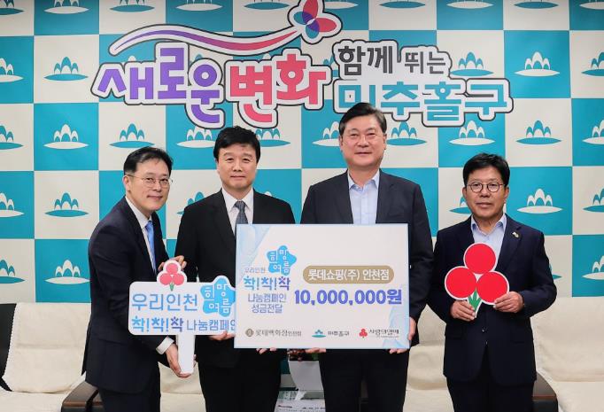 [뉴스서치] 인천 미추홀구에 소재한 롯데백화점 인천점은 13일 인천사회복지공동모금회의 연중 모금 캠페인인 ‘우리 인천, 희망 여름 착! 착! 착! 나눔 캠페인’을 통해 성금 1천만 원을 미추홀구에 전달했다.