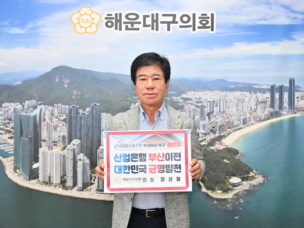 [뉴스서치] 해운대구의회 장성철 의장은 29일 산업은행 본사 부산 이전을 촉구하는 ‘산업은행 부산이전 챌린지’에 동참했다.