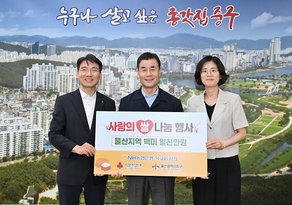 [뉴스서치] NH농협은행 옥교동지점이 7월 25일 오후 2시 30분 중구청 구청장실을 찾아 울산사회복지공동모금회를 통해 1,000만 원 상당의 이웃돕기 백미 10kg 360포를 전달했다.