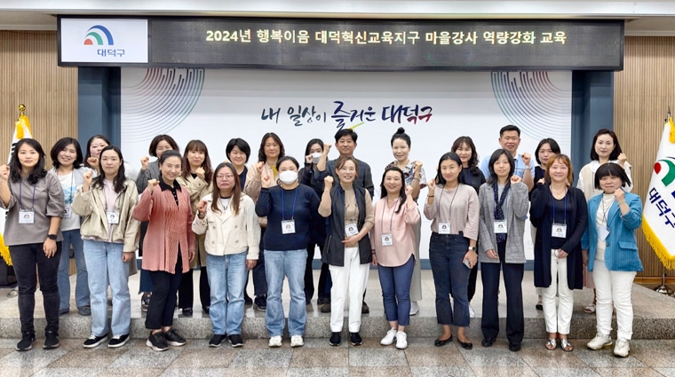 ▲ 대전 대덕구는 14일 구청 대회의실에서 마을강사들을 대상으로 역량 강화 교육을 마친 후 기념 촬영을 하고 있다. |