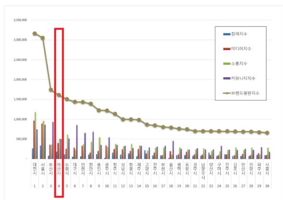 이번 순위는 한국기업평판연구소가 지난 7월 29일부터 8월 29일까지 대한민국 도시브랜드 빅데이터를 분석해 참여지수·미디어지수·소통지수·커뮤니티지수 등 분야별 지수를 합산해 도출한 것이다.