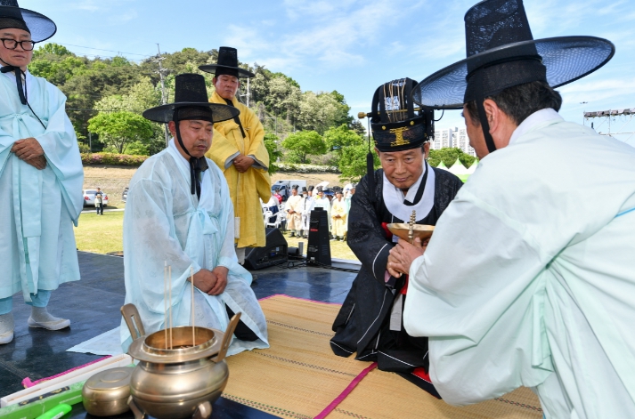 ▲ 초헌관 박남서 영주시장이 _2024영주 한국선비문화축제__ 고유제 첫번째 술잔을 올리고 있다. |