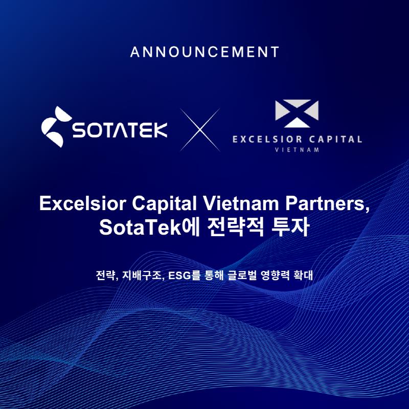 [뉴스서치] 글로벌 IT 서비스 기업 SotaTek(소타텍, SotaTek Technology JSC)은 홍콩에 본사를 둔 아시아 성장형 투자사 Excelsior Capital Asia 산하의 Excelsior Capital Vietnam Partners, LP(이하 Excelsior)로부터 전략적 투자를 유치했다고 공식 발표했다.
