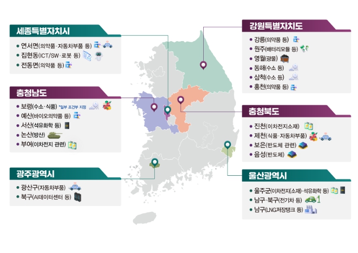 ⑤ (충청북도) 반도체·이차전지 소재 등 첨단산업을 비롯해 식품·자동차부품 관련 기업들이 유치된 제천·보은·음성·진천에 총 109.6만평 지정