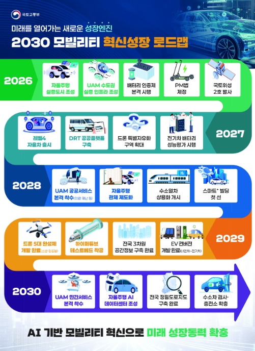 국토교통부는 AI 기술을 활용해 국민의 이동을 더 빠르고 편리하게 바꾸기 위해 향후 5년 간 모빌리티 정책의 이정표를 제시하는 「2030 모빌리티 혁신성장 로드맵」을 수립했다.