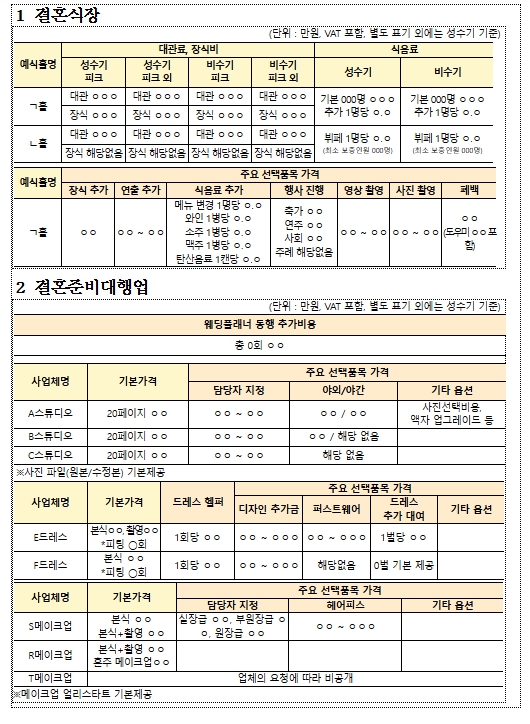 ▲ 결혼식장 및 결혼준비대행업 가격공개 항목(안) |