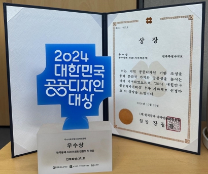 [뉴스서치] 전북특별자치도가 문화체육관광부가 주최하고 한국공예·디자인문화진흥원이 주관한 ‘2024 대한민국 공공디자인대상’에서 광역단체 중 유일하게 우수 지자체로 선정되어 25일 우수상을 수상했다고 밝혔다.