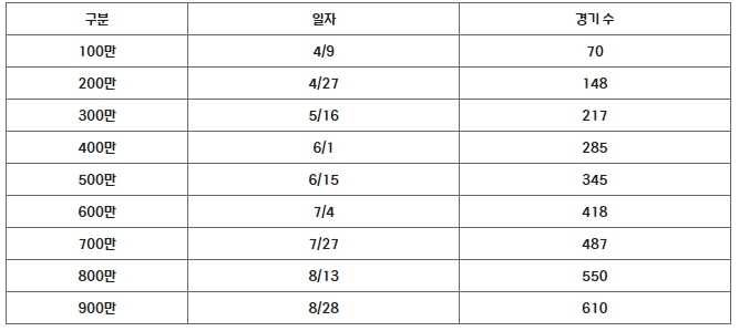 ▲ 2024 시즌 100만 단위 달성 일자 및 경기 수 |
