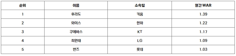▲ 8월 쉘힐릭스플레이어(WAR) 투수 최종 순위 |