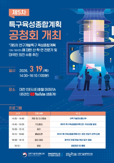 [뉴스서치] 과학기술정보통신부는 2026년 3월 19일 14시 30분, 대전에서(인터시티호텔, 머큐리 A홀) 제5차 연구개발특구육성 종합계획 공청회를 개최한다.
