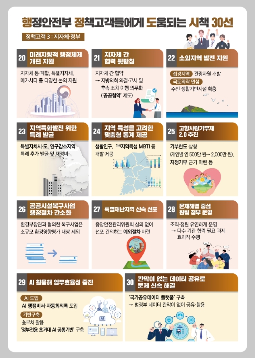 (공간제약 극복) 민선 이후 30년간 큰 변화 없이 유지된 지방행정체제의 미래지향적 개편을 모색하기 위한 거버넌스를 구축하고, 지자체 통·폐합, 특별지자체 구성, 메가시티 등 다양한 방식의 행정체제 개편 논의를 적극 지원한다. 한편, 관할구역을 넘어서는 지자체 간 협력을 원활히 뒷받침하기 위해 ‘공공협약제도’를 도입하고 공동·협력사업에 특별교부세를 지원한다.
