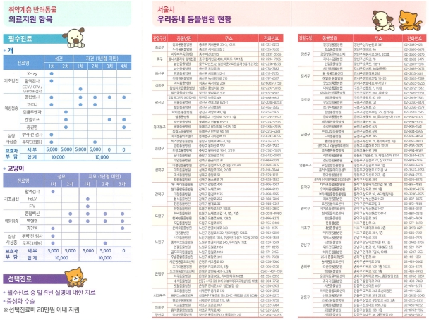 ‘필수진료’(기초건강검진, 필수예방접종, 심장사상충 예방약)에 마리당 최대 20만 원을 지원하고, 기초건강검진 과정에서 발견된 질병에 대한 수술, 중성화 등 ‘선택진료’에 대해서도 추가로 20만 원 이내에서 지원한다.