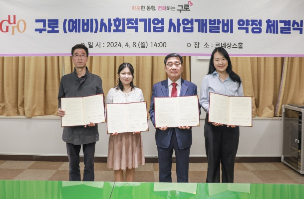 ▲ 문헌일 구로구청장과 참석자들이 8일 구청에서 ‘(예비)사회적기업 사업개발비 약정 체결식’을 마친 후 기념 촬영을 하고 있다. (사진 왼쪽부터 이명하 나우에코 대표, 김민경 온앤오프라인뮤직 대표, 문헌일 구로구청장, 류하나 피스하나 대표) |